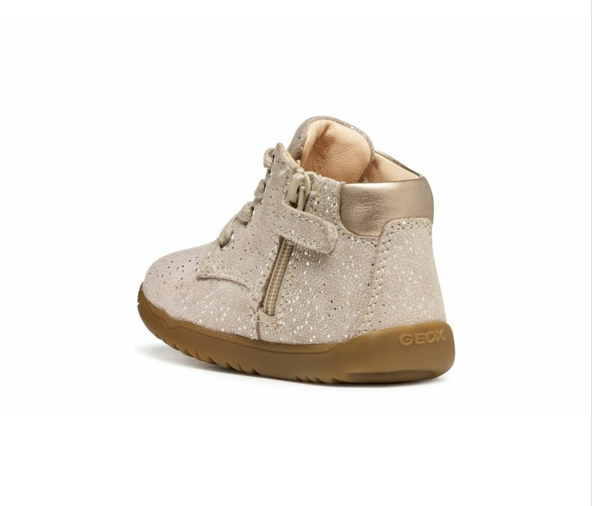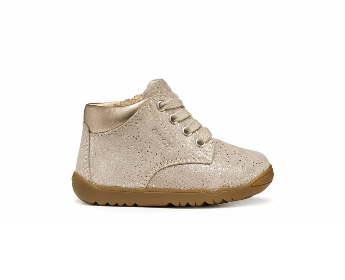 Introduce little feet to the world in style with the Geox Macchia. Crafted in soft beige leather with a charming lace-up design, these shoes are perfect for tiny adventurers taking their first steps. Lightweight and breathable, they allow natural movement while keeping feet comfortable all day. The classic lace-up fastening adds a touch of sophistication and ensures a secure fit, while the durable sole supports growing feet as they explore, play, and discover. Stylish, practical, and made to move with little ones, the Macchia is a perfect choice for everyday wear.